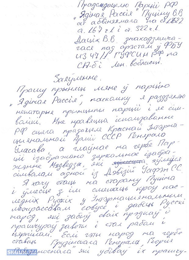 Заявление Мне нравится использованием РФ флага предателя Интернациональной Армии СССР Генерала Власова, а главное на Гербе партии изображено зеркальное отражение Медведя, который являлся символом одной из дивизий Ваффен SS. Я хочу стать на сторону Путина и вместе с ним смешать кровь последних Русских в Интернациональном межрасовом соусе и добить Русский народ, который забыл предков и пращуров заветы и стал рабом и терпилами. Если этот народ на герб ставит Грузинского Генерала «Георгия Победоносца», который убивал их пращуров, то я не имею ничего общего с этими рабами и вместе с Вами готов их истребить в Организованной группе лиц, т.е., в составе «Единой России» исполнить проект Единая Евразия и исполнить становление господства Великого Каганата Хазарии.
